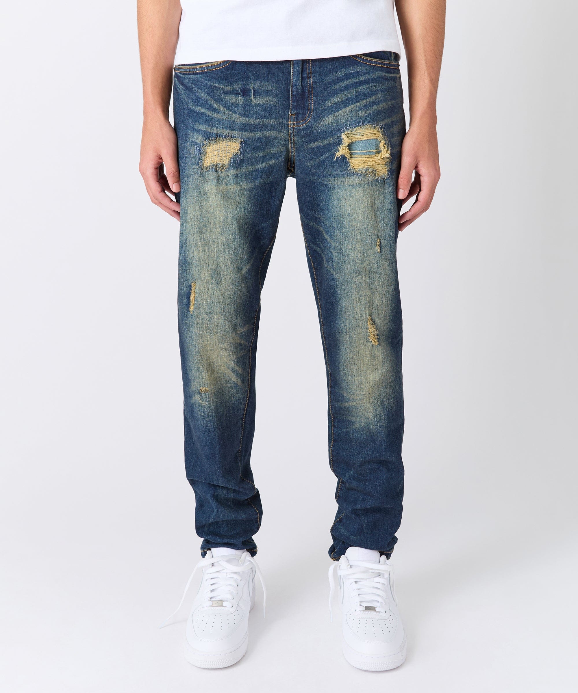 Indigo Washed Tint Rip And Repair Denim Pants - Dark Blue