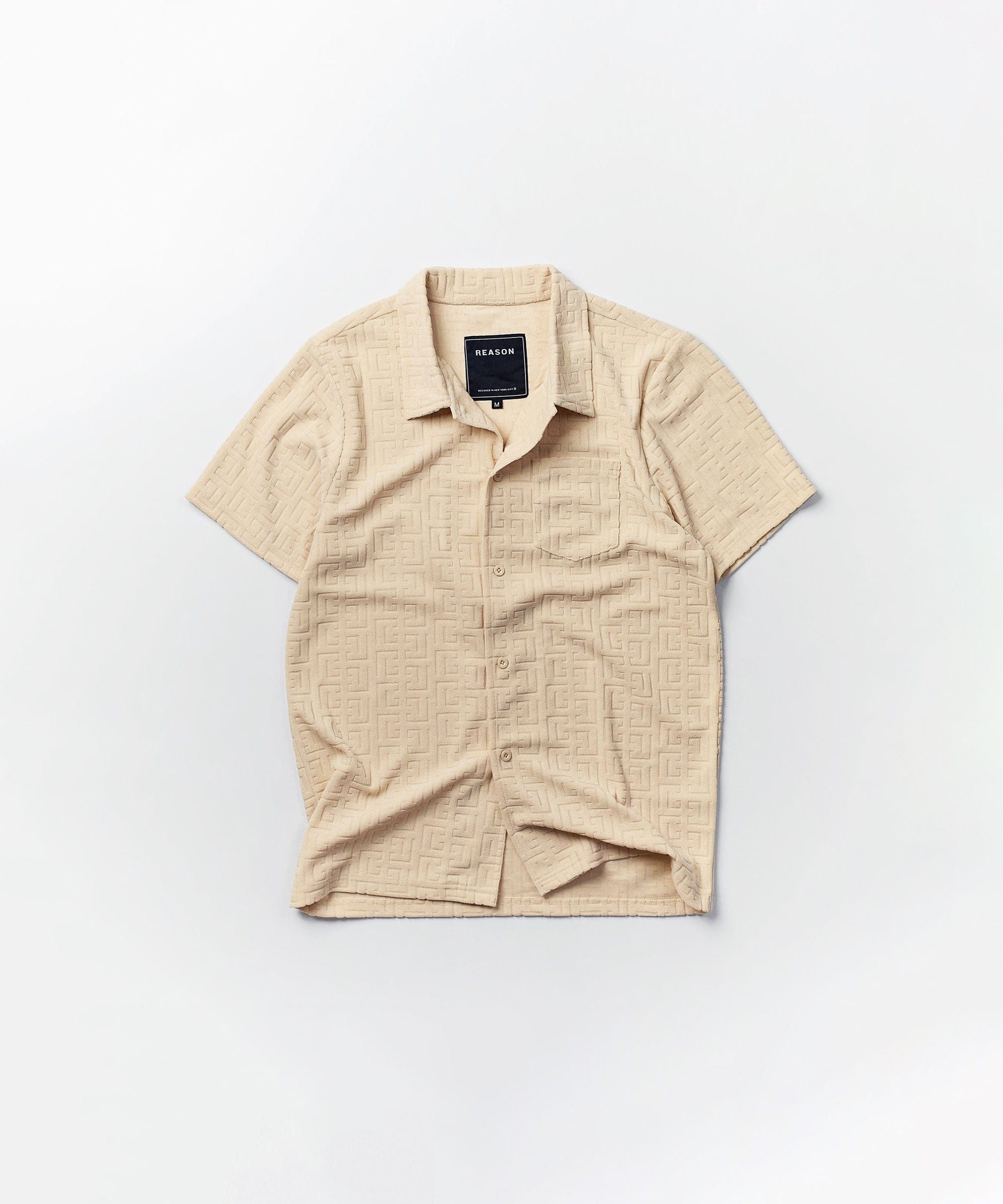 Towel Short Sleeve Embossed Pattern Button Down Shirt - Khaki